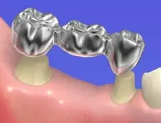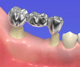 ブリッジは、失った歯の両側の歯を橋渡しするようにして人工歯を入れる治療方法です。この方法では、隣接する健康な歯を支えにするために削らなければいけません。時には、支えとなる歯の神経を取る処置が必要になることもあります。ブリッジに使用する材質は、保険適用される金属やプラスチックの他に、自費治療で使用される金、セラミック、ジルコニアがあります。